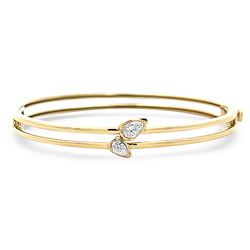 Classy and simple, this 18kt yellow gold Astra diamond bangle features two pear shape diamonds totaling .40ctw.