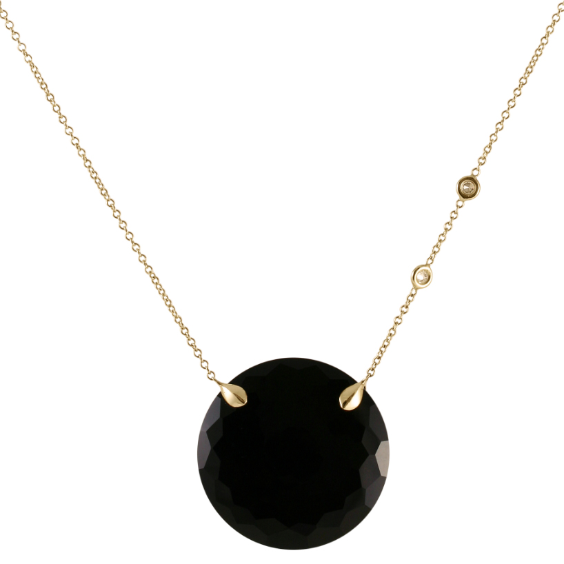 18kt. yellow black onyx disc pendant by Dao Fournier. The chain features two bezel set diamonds at .14ctw. on one side.