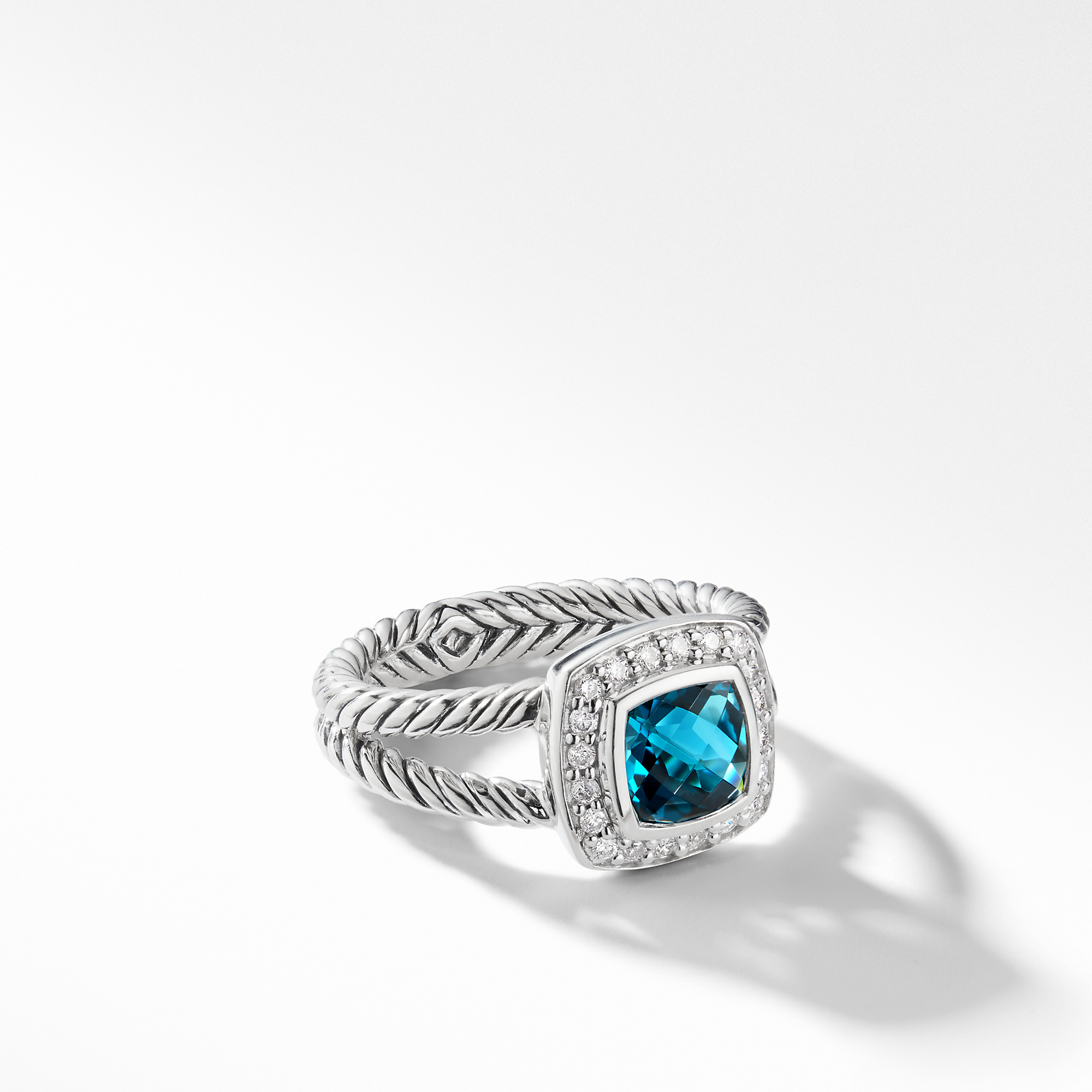 Sterling Silver ’ Faceted Hampton Blue Topaz, 7 x 7mm, Pavé Diamonds, 0.17 total carat weight, ’ Ring, 4-11mm ’ Splitshank