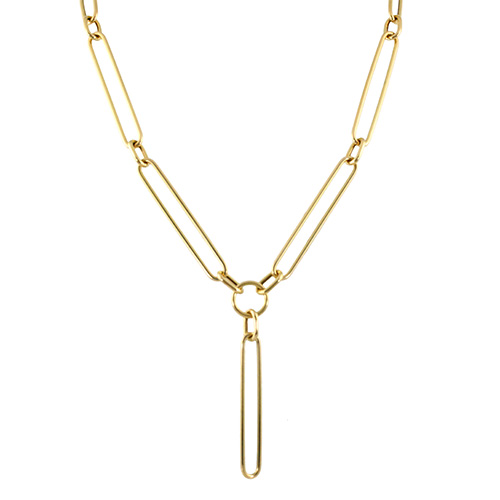 18kt. yellow gold 18″ paperclip Y necklace. Each link measures 40mm.