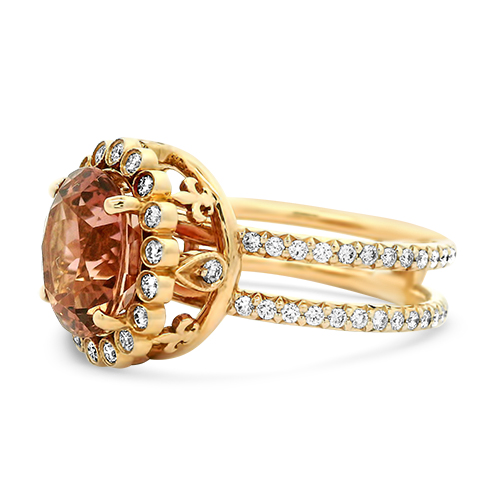 This stunning Erica Courtney Collection “Emily Ann” ring features a 3.78ct oval autumn tourmaline center stone surrounded by a diamond halo and set atop a two-row diamond shank. With 96 round diamonds (totaling 0.80ctw) accenting the warm, peachy-hued center stone, this ring is a colored gemstone masterpiece.