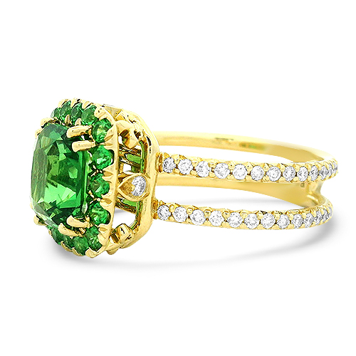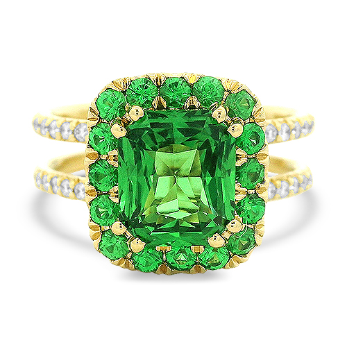 Vibrant and elegant, the Emily Ann ring by Erica Courtney features a striking 2.62-carat tsavorite garnet center, surrounded by a halo of tsavorites totaling 0.48 carats and accented with 0.65 carats of brilliant diamonds. Set in rich 18K yellow gold, the design radiates color and light from every angle, showcasing the lush green hue that makes tsavorite so captivating.