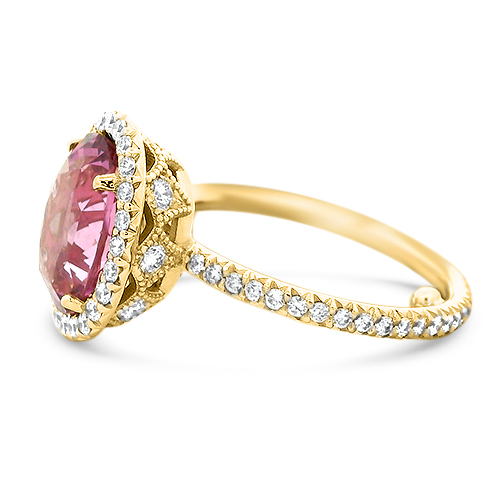This 18kt rose gold Erica Courtney designd “Emani” ring features a 4.15ct oval pink mahenge spinal surrounded by a diamond halo and set with a diamond eternity ring shank (74 round diamonds totaling 0.85ctw).