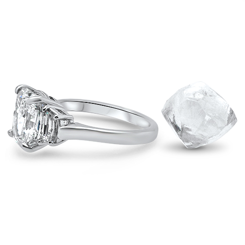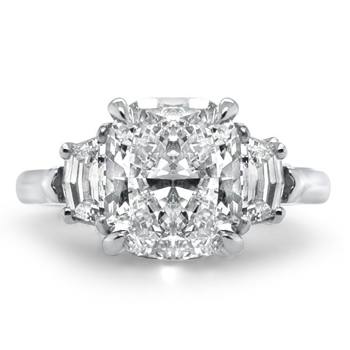 This 3-stone engagment ring features a center 3.03ct cushion cut Forevermark Exceptional diamond flanked on either side by a 0.30ct step-cut “Cadillac” shaped diamond (2 totaling 0.60ct), all mounted in a hand-fabricated platinum ring. Truly a one-of-a-kind masterpiece!