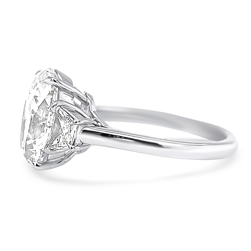 This one of a kind, handmade, platinum engagement ring features a center oval diamond totaling 5.01ct with 2 brilliant cut trapezoid diamonds on the sides totaling 1.01ct. The center diamond has been graded by our in house certified gemologist to have excellent cut grades, H colors and VS2 clarities. The side brilliant trap diamonds have also been graded to have excellent cut grades, G colors and VS1 & VS2 clarities.