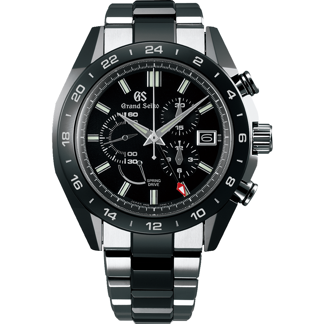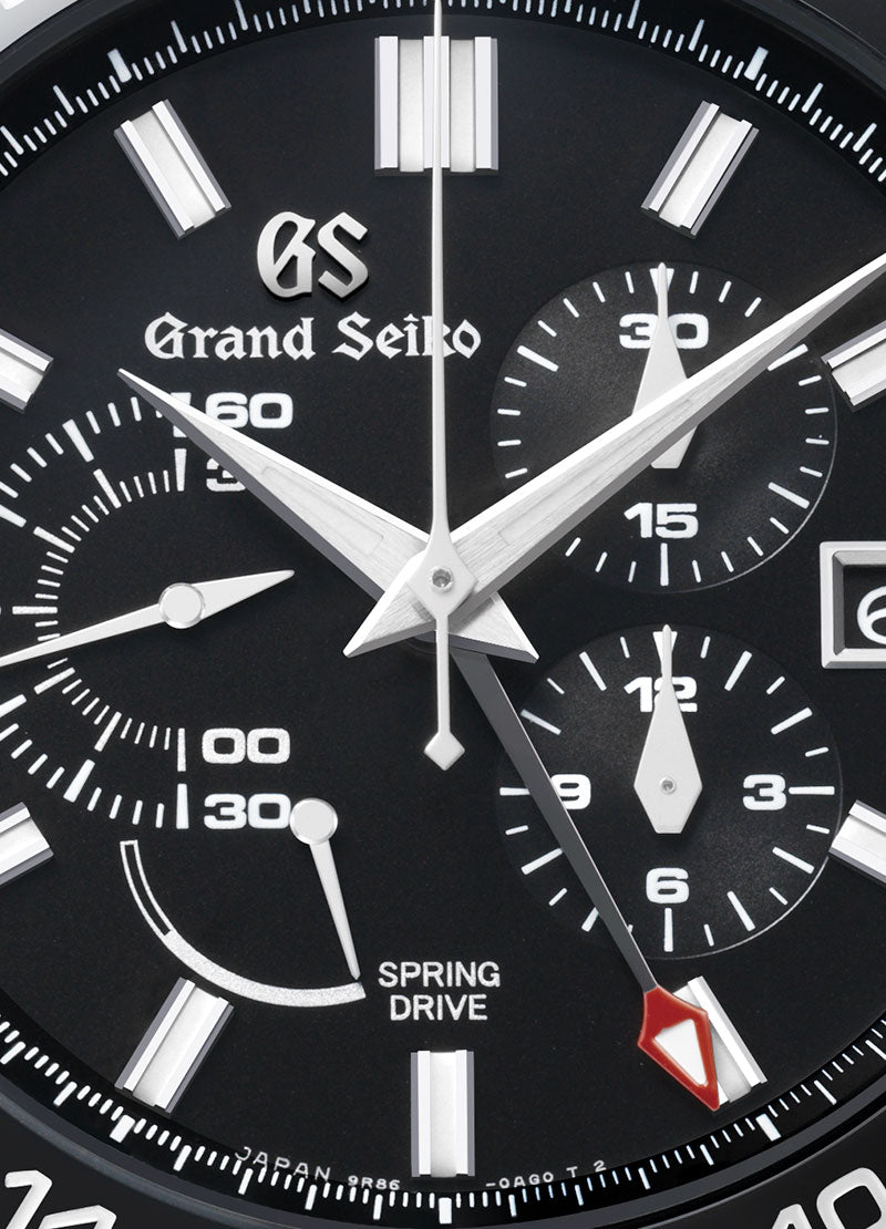 A Spring Drive chronograph with a hybrid case. Inspired by traditional samurai armor, SBGC223 features a titanium inner case so the watch is light and comfortable on the wrist, and an outer case in black ceramic to protect the parts that would otherwise get scratched through daily or active use. Given that zirconia ceramic is seven times harder than steel, new polishing techniques were required to give the watch Grand Seiko’s distinct distortion-free finish. To keep the black dial as clean and legible as possible, the small second hand is presented in a semi-circle dial that shows 00 to 30 seconds on the inner ring and 30 to 60 on the outer ring. The two different shapes of the propeller hand allow the seconds to be read at a glance. Visible through an exhibition case back is Caliber 9R86, the powerhouse movement driving the watch. It’s a Spring Drive chronograph with a column wheel and a GMT function, and it’s rated to +/-15 seconds a month with a power reserve of 72 hours.