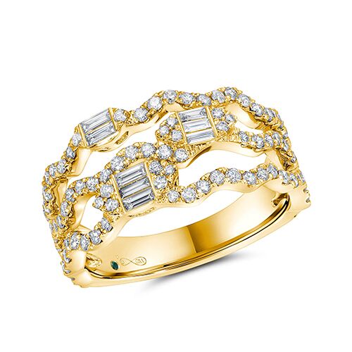 Inspired by the curves of the Amazon River, and designed by Brazilian Graziela Gems, this stunning 18kt yellow gold fashion diamond band ring features 109 dazzling diamonds, totaling 1.00ctw, to sparkle like moving water’s gleaming surface. This collection means so much to Graziela, that she is donating 10% of the proceeds directly to the Rainforest Trust, where funds are used where theyÂ’re needed most, directly on the grounds of the Rain Forest.