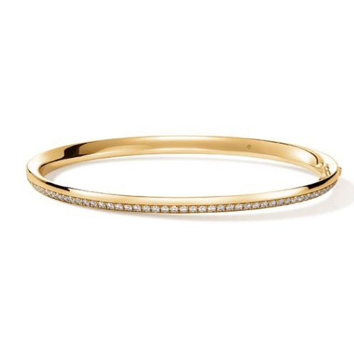 This 18kt yellow gold bangle features 45 round brilliant pave diamonds stationed along the bangle totaling .79ctw.
