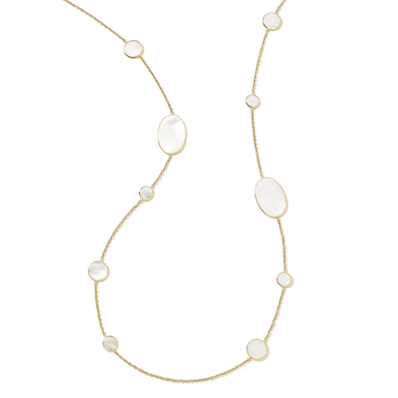 18k Yellow Gold Polished Rock Candy Mother of Pearl Multi Shape Necklace. Length 37″”. Lobster Clasp.