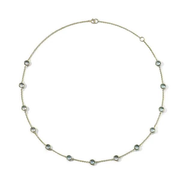 Strung with 13 stations of Swiss blue topaz, this long necklace is a lovely way to add color to every day and evening looks. Hand-faceting ensures that the stones glisten beautifully in the light, while warm 18K gold bezels frame each one to bring lush contrast to the design of the piece.