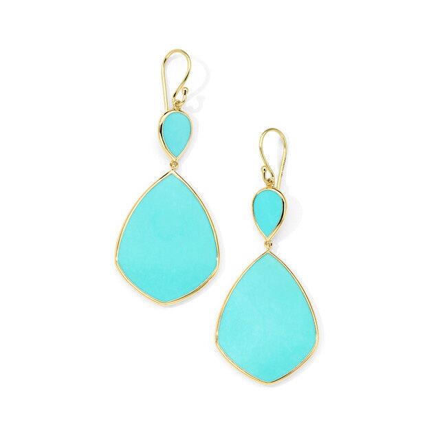 Beautiful, smoothly polished slices of Kingman mine turquoise are displayed to the fullest on these double drop earrings. The geometric shapes are finely encased in 18K yellow gold, creating a classic combination of hues. The simple hook closures make them effortless to wear.