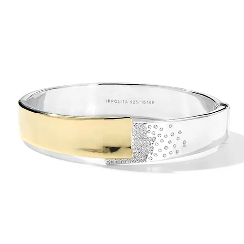 Dotted with round brilliant diamonds, made to look as if gradually scattered, this handmade bracelet comes in 18K yellow gold and 925 silver to create a unique two-tone effect. It can be worn alone as a statement piece or stacked with eclectic styles, and comes hinged, so that it’s effortless to slip over the wrist.