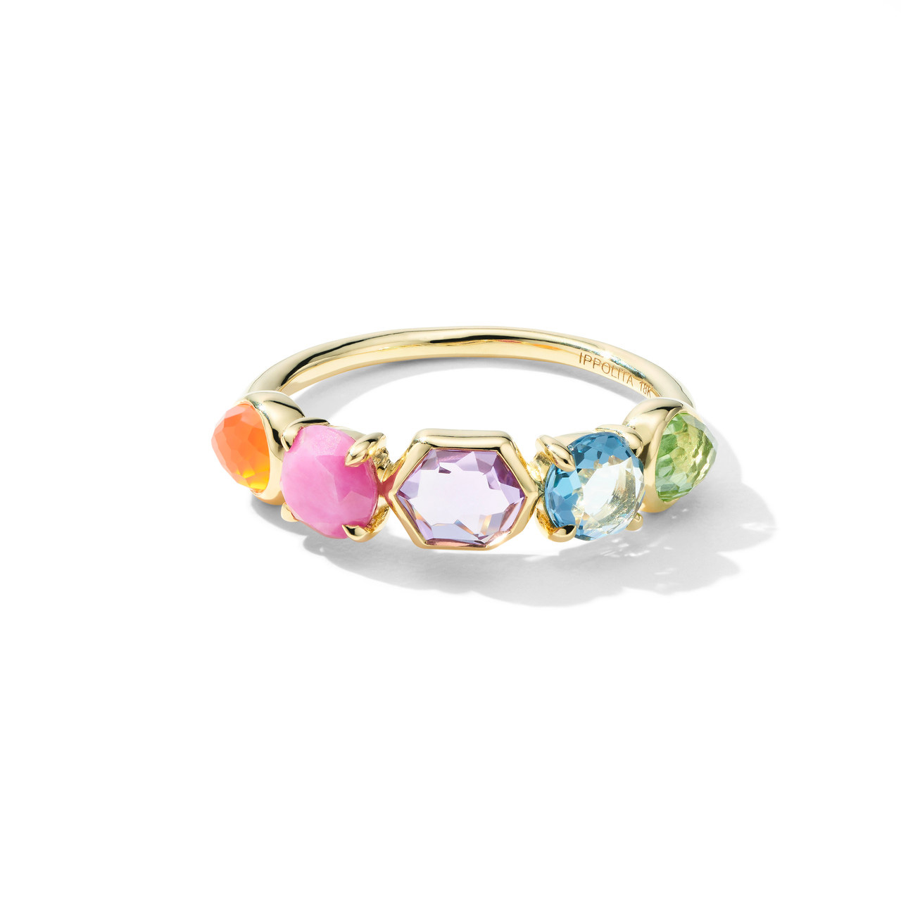 Peridot, London blue topaz, African ruby, orange carnelian and amethyst glow in beautiful formation on this five-stone ring. The shapes are eclectic and the mounts vary from prongs to bezel settings. All are encased in 18K gold, which plays elegantly off the rainbow color palette.