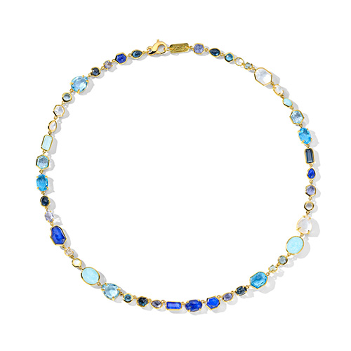 Arranged in a mix of tones, shapes and scales, the gems distinguishing this Rock Candy® necklace are reflections of summer colors and the deep blue sea. The design comes in 18K yellow gold with light iolite, lapis lazuli, London blue topaz, blue topaz, ice quartz, mother-of-pearl, Swiss blue topaz, larimar, and doublets of rock crystal over lapis lazuli, punctuating its length.