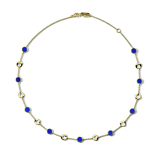 This beautiful 18kt yellow gold necklace features alternating stations of wavy gold discs and blue lapis stone slices. It measure 16-18″ in length.