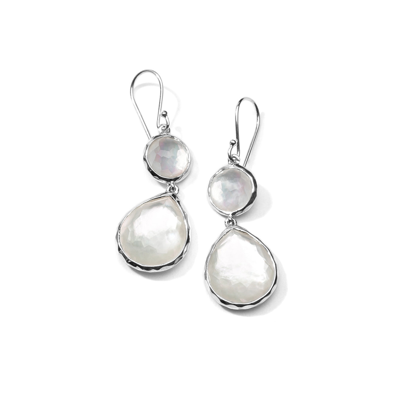 Sterling silver mini Snowman double teardrop earrings from Ippolita’s Wonderland collection. These earrings drop 1.87″” and feature clear quartz and Mother-of-Pearl.
