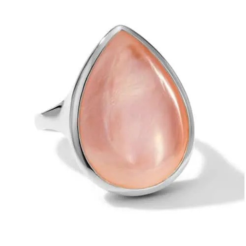 This cocktail ring is made of 925 silver, which is a highly polished variant of the metal coated in 99.9% pure silver, to brighten its glow. ItÂ’s then sculpted into an elegant teardrop shape, and inlaid with pink shell, a natural material prized for its soft iridescence. It looks beautiful as a solo piece or worn alongside equally bold or daintier styles for contrast.