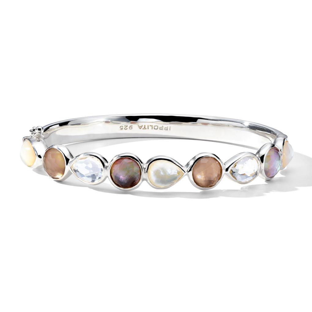 Brown shell, black shell and mother-of-pearl comprise the array of sliced stones that partially encircle this highly polished bangle bracelet. The precious elements are enclosed within cast 925 silver, which is a brightened high-shine version of the metal, and presented in an artful arrangement of shapes.