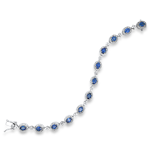 This stunning 18kt white gold bracelet features 12 oval blue sapphires accented by 239 bead set round brilliant diamonds totaling 2.49ctw and measures 7.25″ in length.