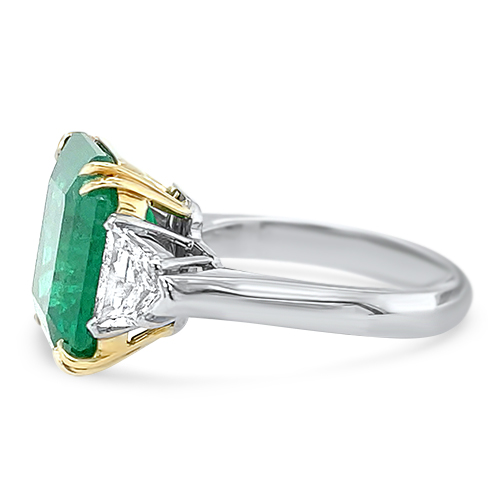 This platinum three-stone ring features a center 9.06ct square emerald cut Zambian Emerald with side Cadillac shield shaped diamonds (two totaling 0.81ctw). A stunning, colorful, statement-making ring will bring plenty of smiles to the lucky lady who wears it!