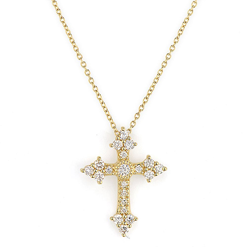 From the Jude Frances Provence Collection, the Champagne Small Cross Pendant features pave and bezel set round diamonds (totaling 0.27ctw) set in 18kt yellow gold on a delicate, 16-inch chain.