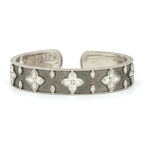 This Jude Frances-designed cuff-style bange features sterling silver with black rhodium and a beautiful design of white topaz gemstones.
