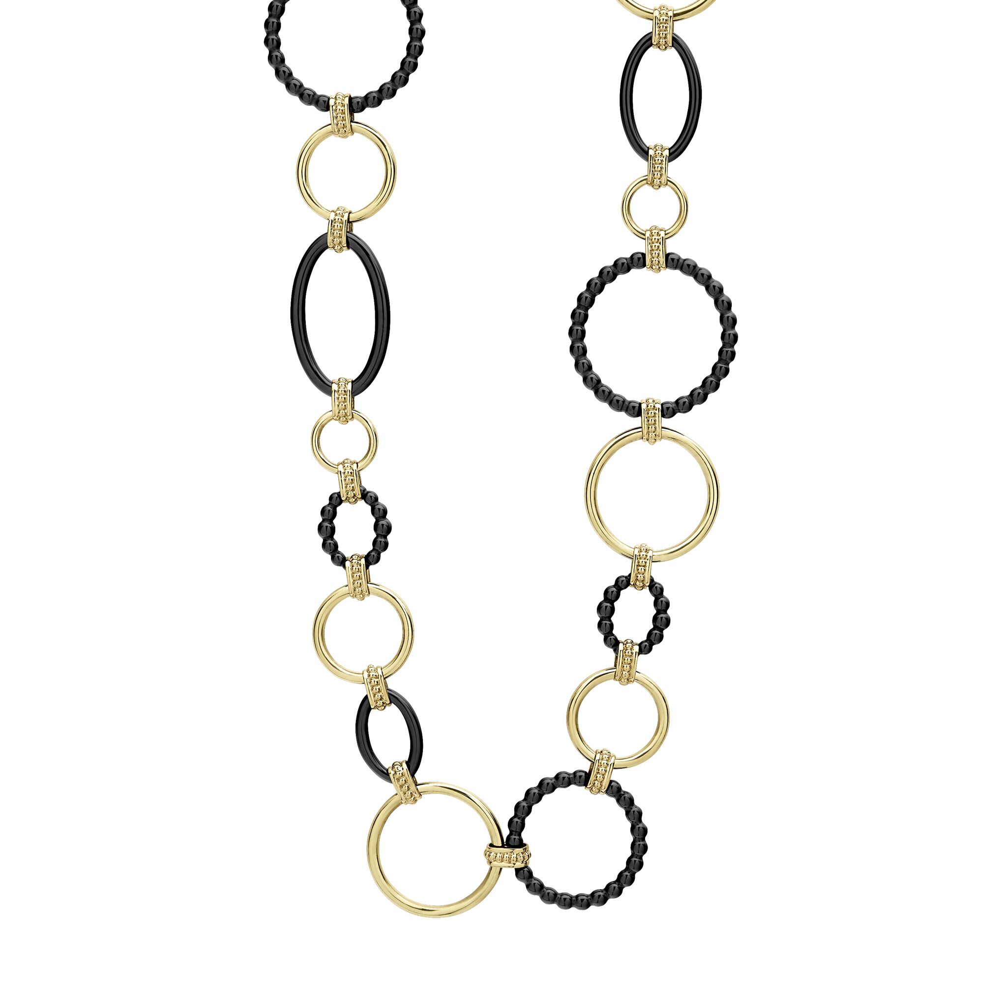 18kt yellow gold and black ceramic alternating Caviar circle, oval and beaded link 18-inch necklace.
