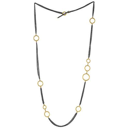 Rich golden yellow, 24K gold circles of various sizes are spaced throughout a 36″ long oxidized sterling silver cable necklace which can also be worn doubled. An extra long toggle clasp ensures the necklace is always secure.
