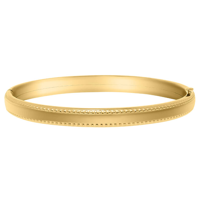 This 14kt. yellow gold-filled baby bangle features a beautiufl milgrain-beaded edge. This bracelet is 1 3/4″ in diameter when closed, and opens with a hinge.