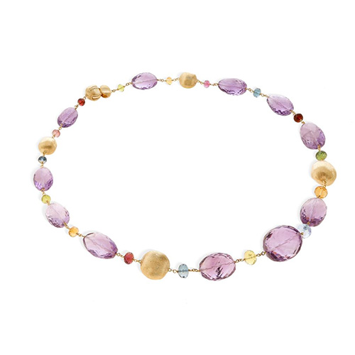This remarkable Marco Bicego 18kt yellow gold necklace features multiple sizes and types of gemstones including amethysts, blue topaz and citrine and measures 18.5″ in length.
