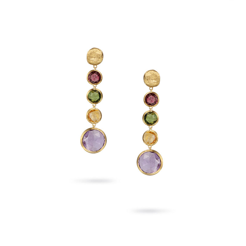 18K yellow gold drop earrings with rose cut cushion multi-colored semi-precious gemstones. Inspired by a tropical Indian sunset and the stone-cutting heritage of Jaipur, these Jaipur Color Multicolor Gemstone Earrings are hand engraved by Italian artisans. Earring length: 1.69″.