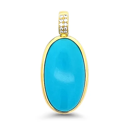 This Mazza Company gemstone pendant features a center 22.30ct oval Turquoise cabochon bezel-set in 14kt yellow gold with a diamond-accented bale (0.10ctw) that opens and closes, making it easy to put on your favorite chain.