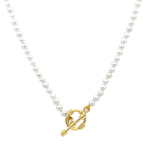 This freshwater pearl necklace, designed by the Mazza Company, features 16 inches of 3mm pearls and is finished with a textured 14kt yellow gold toggle clasp. The perfect layerable, modern pearl necklace!
