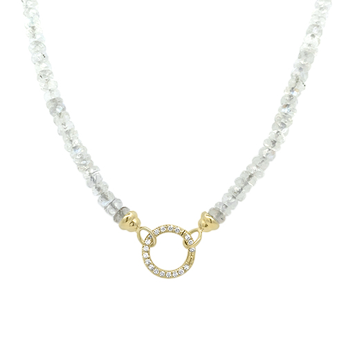 This Mazza Company necklace features 16 inches of faceted moonstone rondels with 14kt yellow gold end caps and a pave diamond (0.12ctw) circle closure clasp.