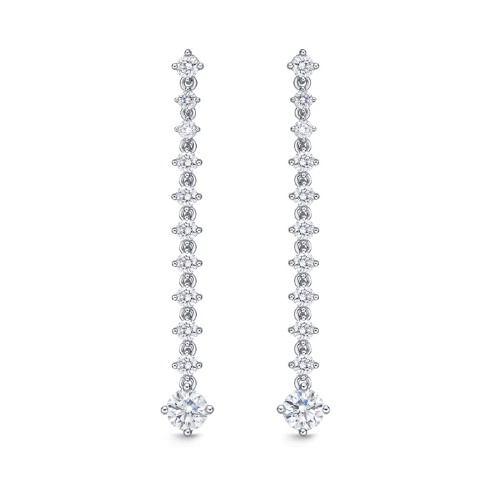 This pair of Memoire “Lila” diamond drop earrings in 18kt white gold features 22 round brilliant diamonds totaling approximately 1.10ctw and measure 1.25 inches in length.