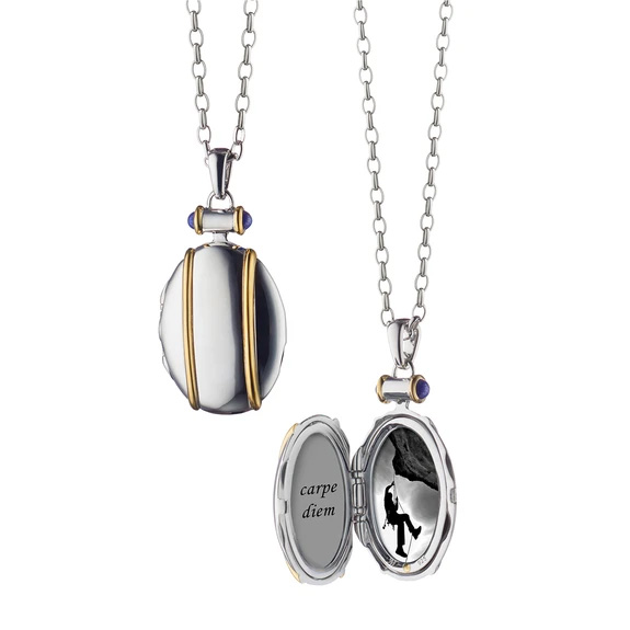 Sterling silver and 18kt. yellow gold two-tone locket for two images on a 32″ sterling chain. The locket measures 1.75Â’ tall, 15/16Â’ wide. There are two cabochon cut lapis gemstones accenting the design.