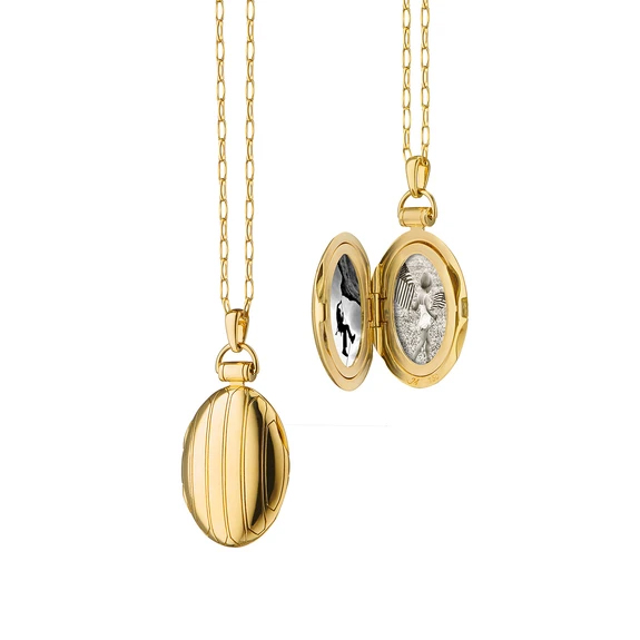 18kt. yellow gold large pinstripe locket on a 30″” chain. This locket holds two images and measures 1″” tall and 11/16″” wide.