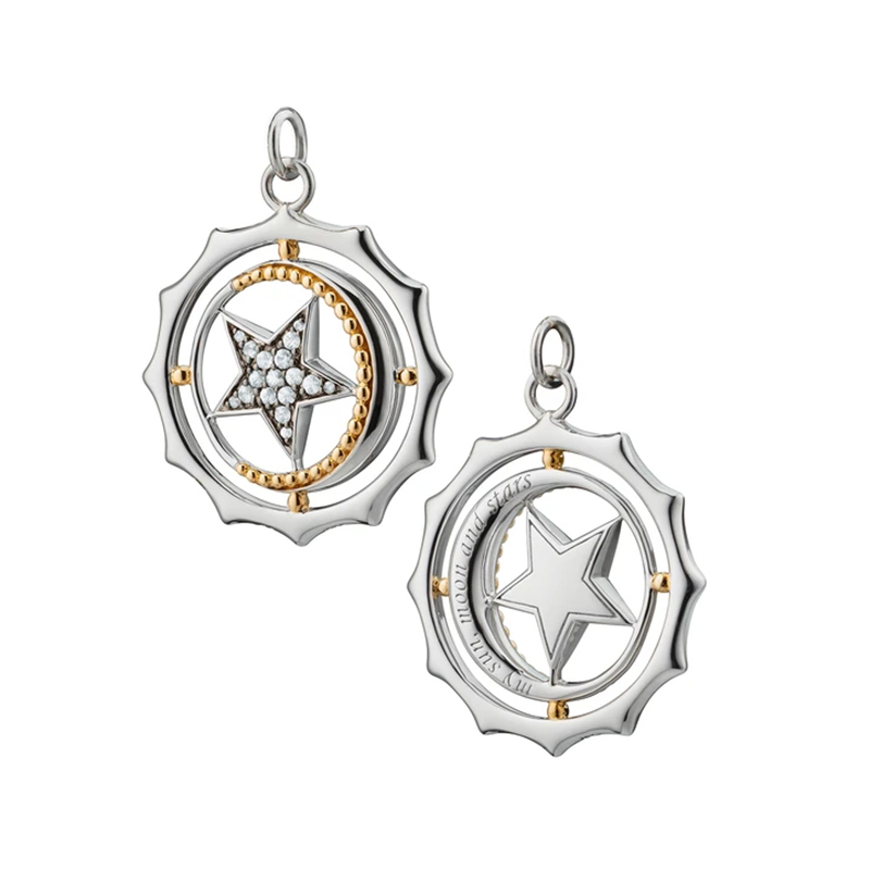 Sterling silver and 18kt. yellow gold sun, moon and star charm for a bracelet or necklace. This charm is set with white sapphires and measures 1″” in diameter.