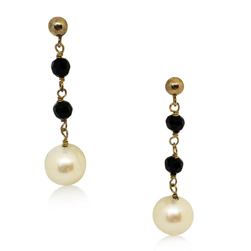 Sterling silver with yellow vermeil overlay drop black onyx and pearl earrings. These earrings measure 1 1/4″” in length.