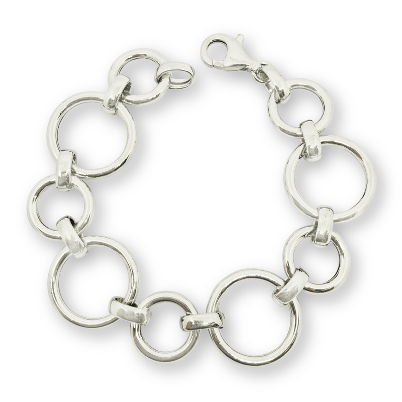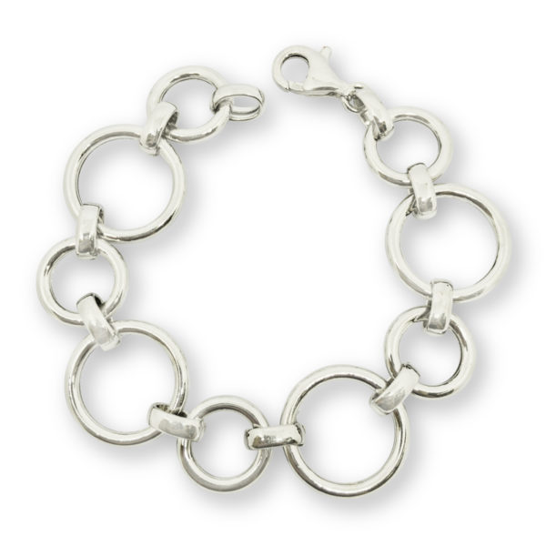 Sterling silver circle link 7 3/4″ bracelet. The alternating circles measure 1/2″ and 3/4″.