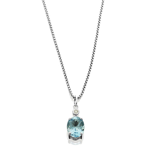 This remarkable sterling silver pendant features a center oval sky blue topaz accented by a bezel set round diamond and measures 16-18″ in length.