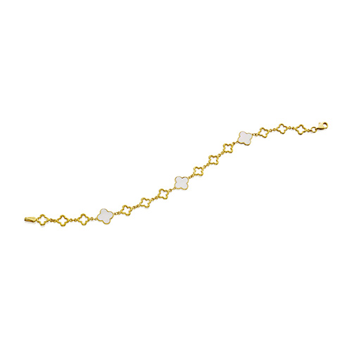 This beautiful bracelet features open quatrefoil stations and mother of pearl quatrefoil stations and measures 7.5″ in length.