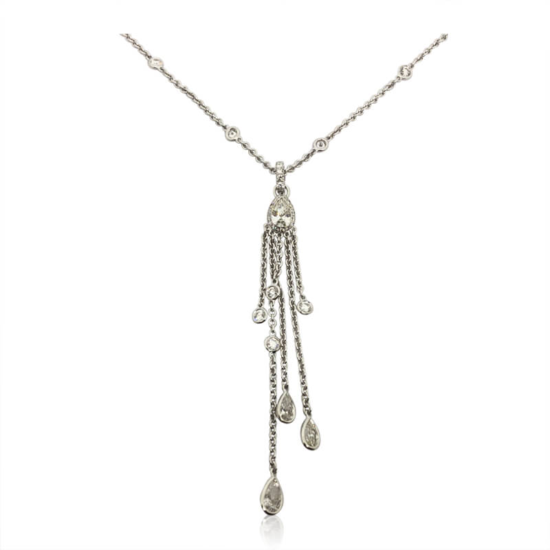 18kt. White Gold diamond dangle lariat chain necklace. The lariat features one centrally set pear shaped diamond at .42ct. surrounded by a diamond halo. There are 5 chains that dangle below the main stone with round and pear shaped diamonds. The lariat is set on a diamond eye glass chain. The total diamond weight is 1.44ct.t.w. The length of the chain is 16″ and the lariat length is 3″.