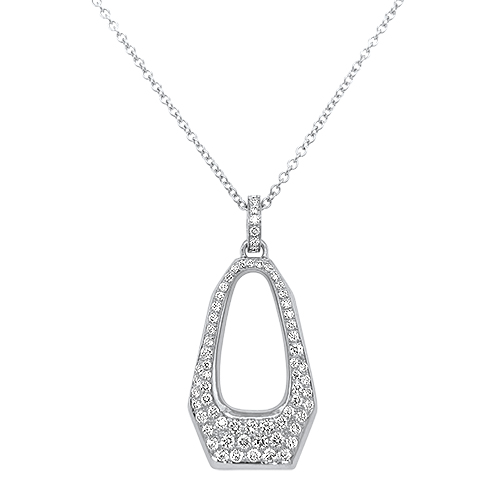 This 18kt white gold diamond pendant features 1.36ctw of round brilliant diamonds in an elongated hexagon-shaped open pendant with diamond bale and hangs from a 16-inch white gold pendant chain.