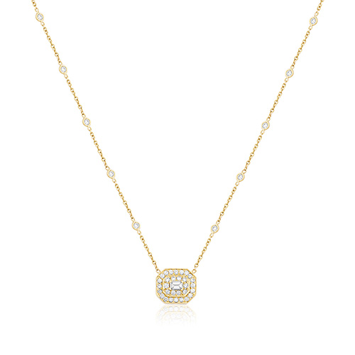 This 18K yellow gold necklace, designed by Penny Preville, features a center emerald cut diamond surrounded by two rows of round diamonds and ten bezel set diamond eyeglass stations on an adjustable 16-17″ chain.