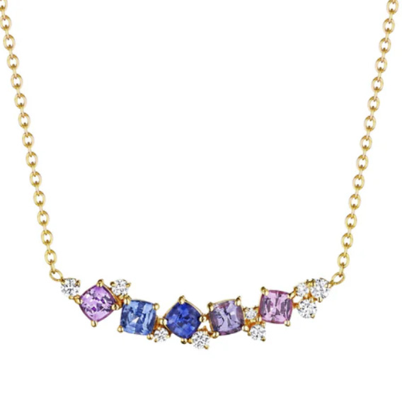 From the Watercolor collection, this 18kt yellow gold rainbow sapphire confetti bar necklace features round brilliant diamonds totaling .29ctw and an assortment of cushion cut colorful sapphires. The necklace measures 18″ in length.