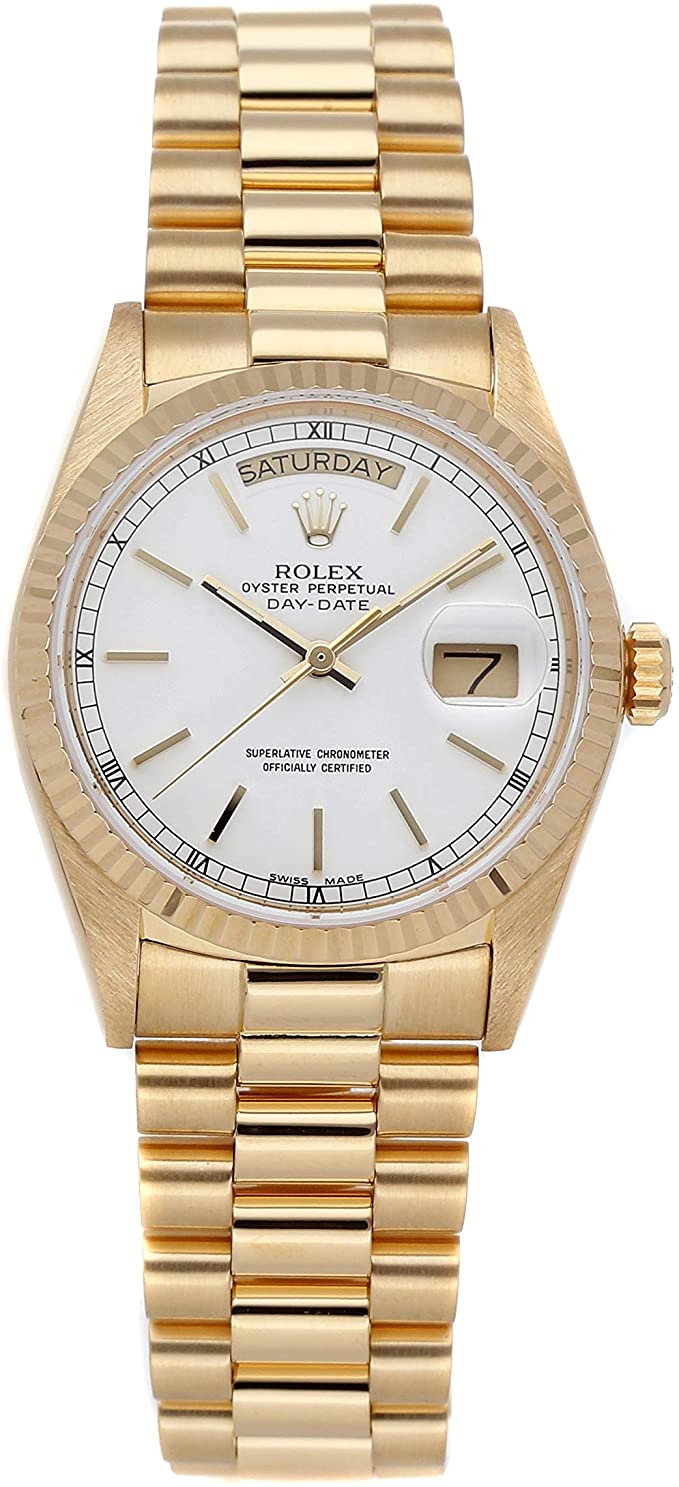 Rolex’s Day-Date automatic watch features a 36mm 18k yellow gold case surrounding a white dial on an 18k yellow gold President bracelet with folding buckle. Functions include hours, minutes, seconds, and date. All of our pre-owned watches come with a 5-year warranty on the inside movement.