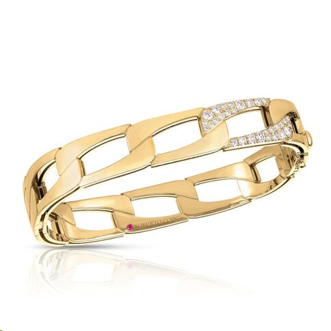 Experience the timeless beauty of Roberto Coin’s Navarra collection. Crafted with impeccable detail, this gorgeous bangle features polished 18K yellow gold embellished with dazzling diamonds totaling .50ctw.
