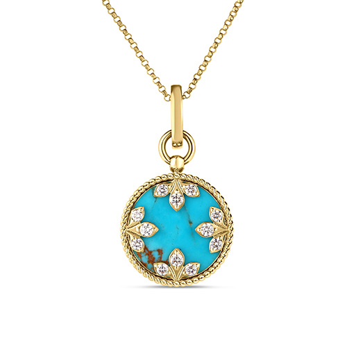This stunning Roberto Coing Venetian Princess necklace highlights the beauty of turquoise accented by round brilliant diamonds and measures 18″ in length.