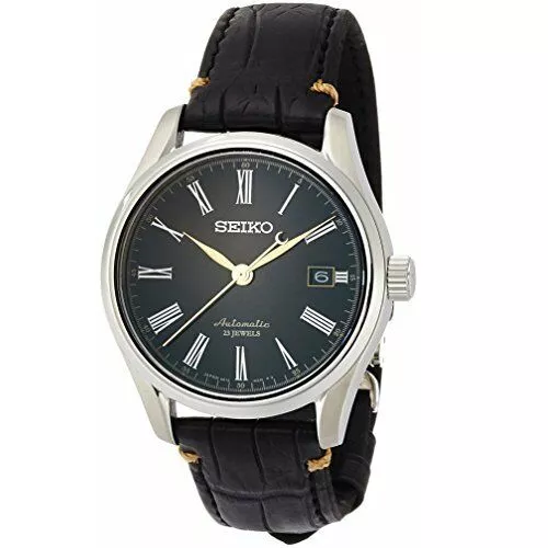 Stainless steel black dial Seiko Presage date watch. This 40.5mm watch features a see-through caseback, an automatic movement and a crocodile leather strap.